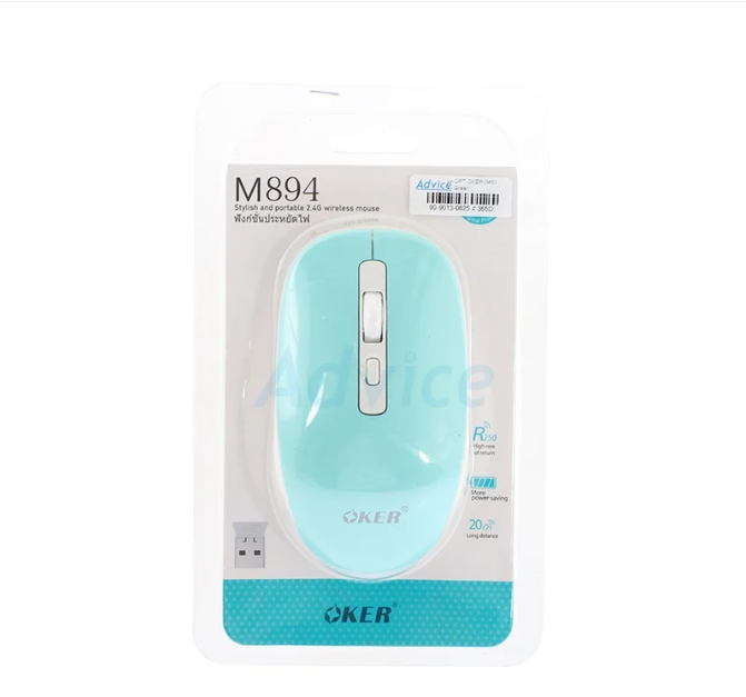 Interface : USB Wireless 2.4GHz Resolution : 1600 DPI Buttons : 4 Buttons Oker เมาส์ไร้สาย รุ่น M894 ดีไซน์ทันสมัยรูปทรงกะทัดรัดพกพาง่าย ใช้งานสะดวกเพียงเสียบ USB ก็ใช้งานได้ทันทีไม่ต้องมีไดรฟ์เวอร์ ปรับความเร็วได้ 3 ระดับสูงสุด 1600DPI ประหยัดพลังงานแบตเตอรี่ AA แถมมากับตัวเมาส์ ใช้งานได้ไกลถึง 20 เมตร น้ำหนักเบาออกแบบตามหลักสรีรศาสตร์