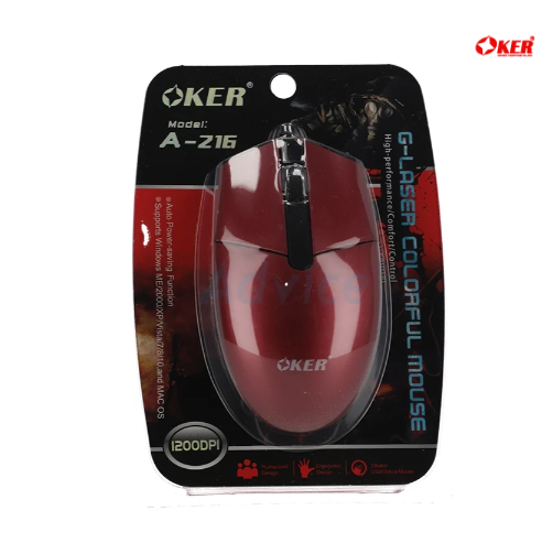 Interface : USB 2.0 Resolution : 1200DPI จำนวนปุ่ม : 3 Buttons Oker เมาส์อเนกประสงค์หัวเสียบ USB รุ่น A-216 ความทนทานสูง สามารถใช้งานได้กับพื้นผิวที่หลากหลายไม่ว่าจะเป็นโต๊ะที่มีความมันวาว หรือปกแม็กกาซีนแบบเงาก็สามารถใช้งานเป็นแผ่นรองเมาส์ได้อย่างสบาย โดยมีการถ่วงโลหะไว้ในตัวเมาส์เพื่อให้การใช้งานเมาส์มีความแม่นยำมากขึ้น ผิวภายนอกเคลือบด้วยสารกันลื่น เพื่อป้องกันเหงื่อที่มือจากการใช้งานเมาส์เป็นเวลานานๆ